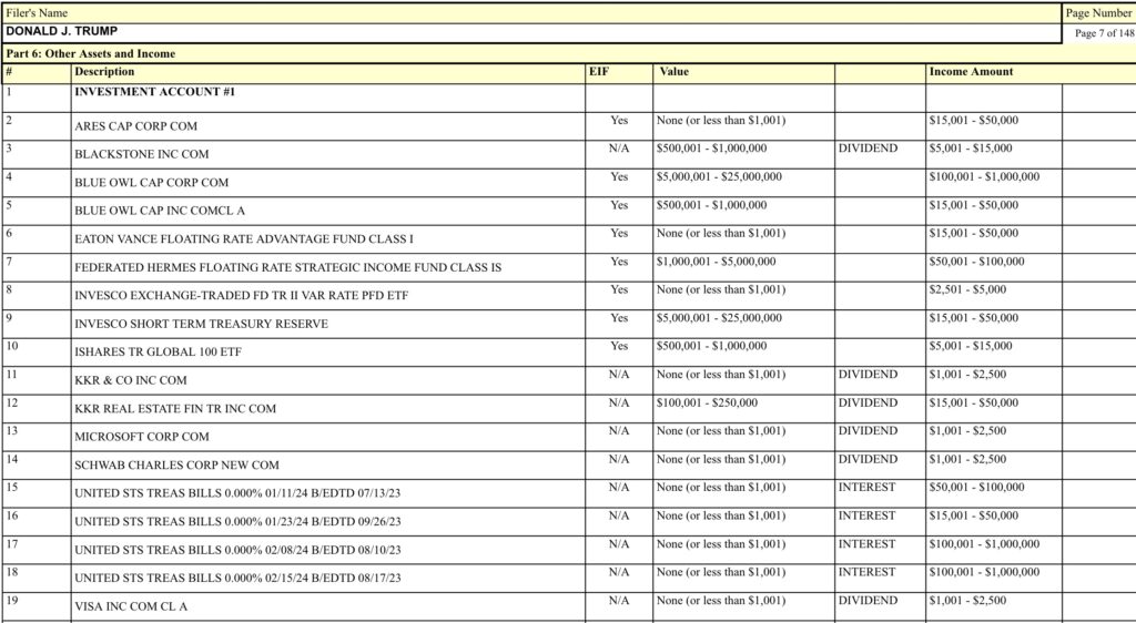 И хотя президент Трамп перечисляет сотни индивидуальных инвестиций в индивидуальные акции, облигации и различные ETF и инвестиционные фонды, на самом деле лишь несколько находятся в диапазоне «$5+ миллионов», что значительно облегчит наш поиск.
